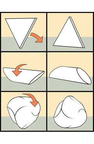 Illustrating the difference between an unstable and a stable equilibrium, a plywood triangle (top), regarded as a two-dimensional object, may balance precariously on one of its three points or come to rest on one of its three long sides. Similarly, a rod with both ends sliced off at oblique angles (middle) teeters on its short side—as it would if stood on either pointed end—but finds stability on its long side. Designed by mathematicians, the Gömböc (bottom) never rests for long on any point except its one and only stable surface.