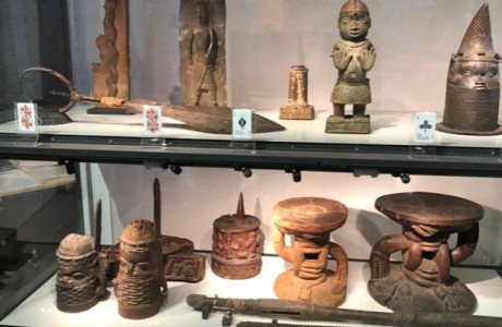 The displays above and below of Benin bronzes are some of the ninety-four bronzes currently at the Rautenstrauch-Joest Museum in Cologne, Germany. They were among the 3,500-4,000 bronzes that were looted in 1897 by British troops from the royal palace in Benin City before the city was set on fire. In an agreement between the governments of Germany and Nigeria, many of the 1,100 bronzes originally bought by Germany are beginning to be returned to Nigeria.