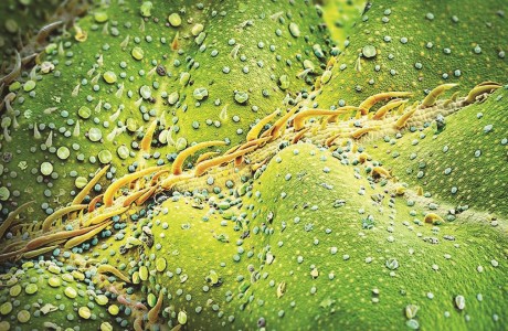 The large deflated spheres on the surface of this basil leaf contain defensive chemicals that are released when the leaf is bitten, torn, or crushed.