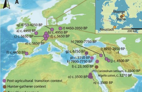 Europe with inset of study area and sites where pot residues were acquired; including the Near East and northern Africa, indicating early contexts where various spices have been recovered.