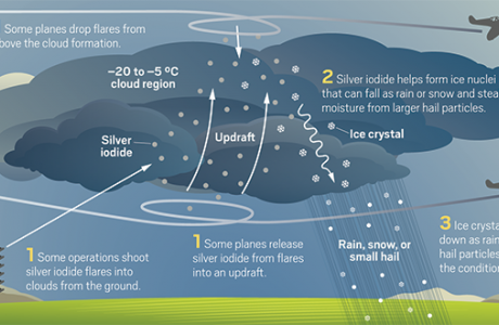 Weather modification firms launch silver iodide flares from planes or from the ground into cloud formations to try to increase rainfall or mitigate hailstorms.